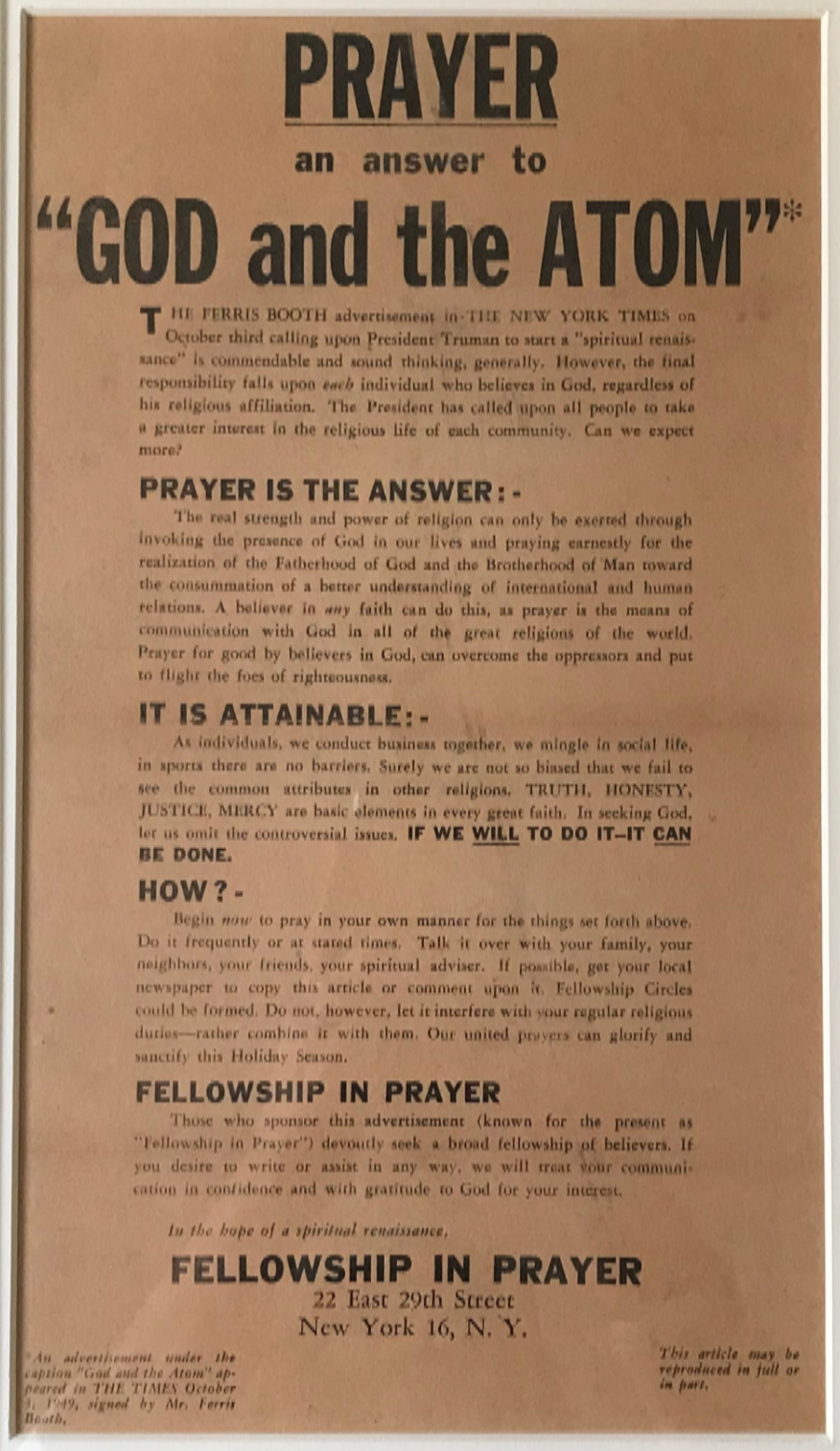 In 1949, amid global unrest following the bombings of Hiroshima and Nagasaki and the end of World War II, a wealthy financier named Ferris Booth published a full page ad in the New York Times entitled, "God and the Atom." In the ad, Booth challenged President Truman to call upon the resources of God in solving the world's crises.